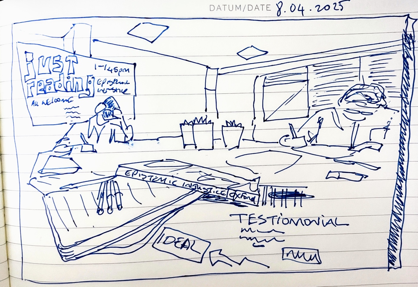 jxst reading takes as it’s starting point the book Epistemic Injustice: Power and the Ethics of Knowing, by philosopher Miranda Fricker, as a way to begin engaging creatively with images and imaginaries of knowledge and injustice. No prior knowledge or reading of this book (or philosophy in general) is necessary to participate. Many other books and textual references have come into play since the first session took place in February 2025.