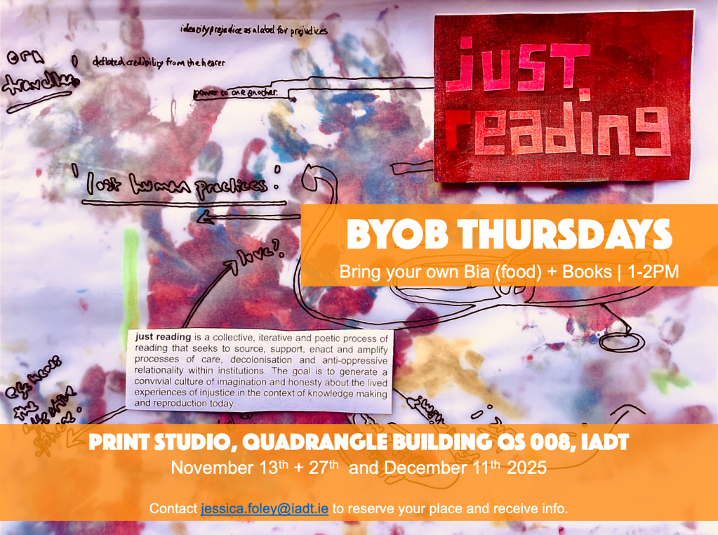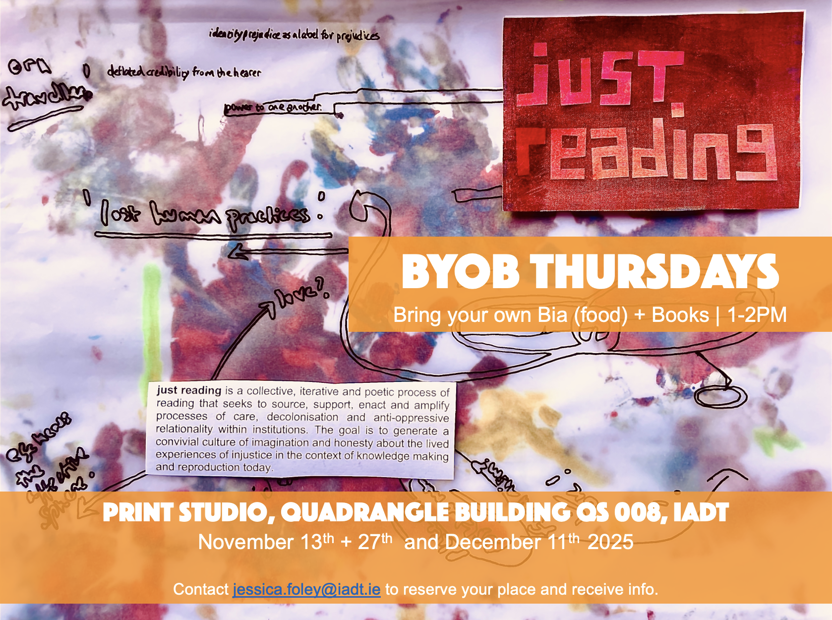 jxst reading aims to make room for people to listen, speak, make and be together, creatively and thoughtfully, through acts of reading. Forthcoming sessions will take place at lunchtimes on Thursdays (13th/27th Nov, and 11th Dec), in the Print Studio at IADT (QS 008) from 1-2PM: