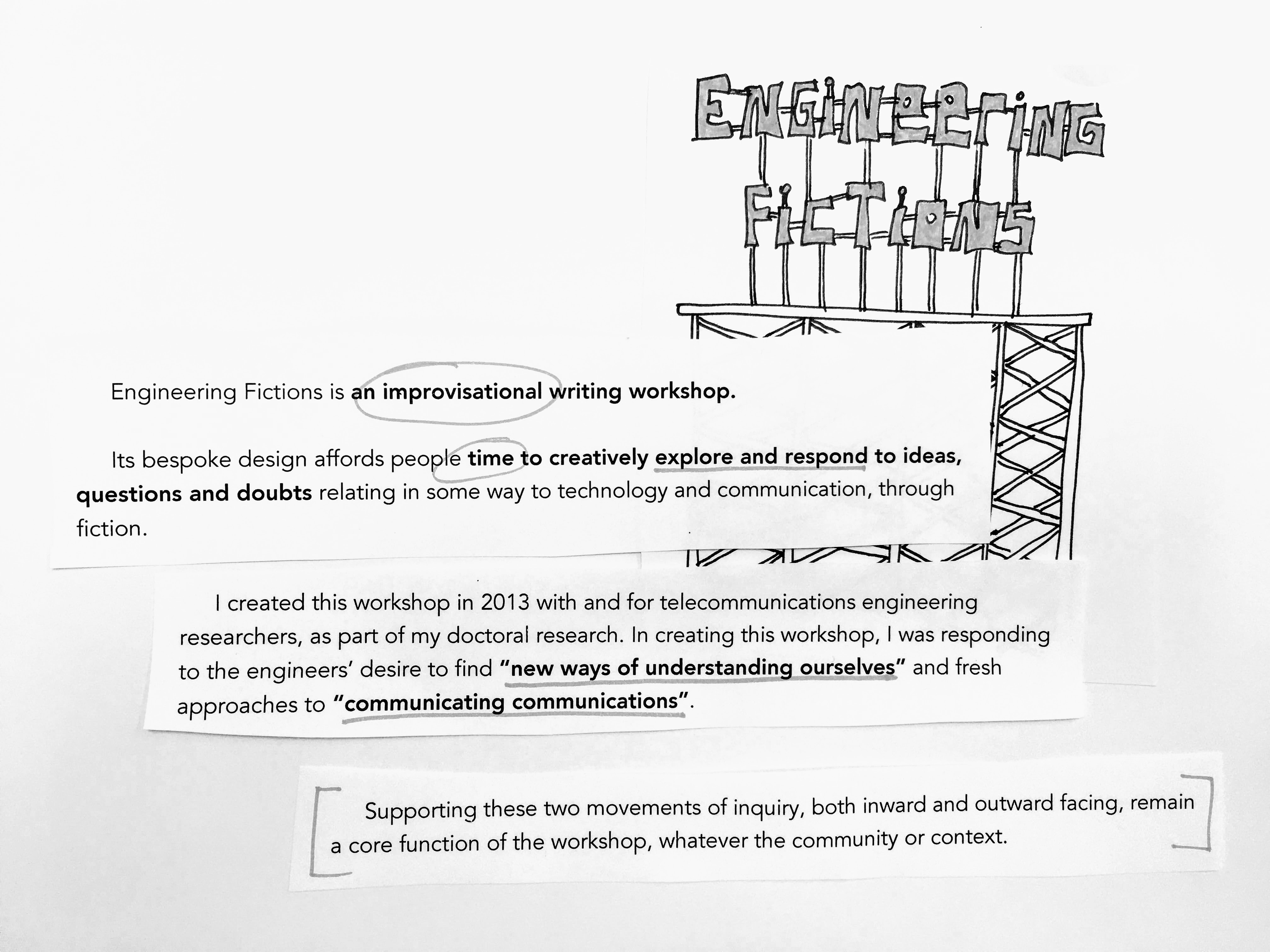 If Engineering Fictions can be understood as an experiment in diffractive pedagogy, where epistemological categories and habits of communication are subtly destabilised and disrupted, and where the discipline of engineering becomes complexified, then the writings generated during the sessions can be understood, in Haraway’s words, as “maps where the effects of difference appear”.