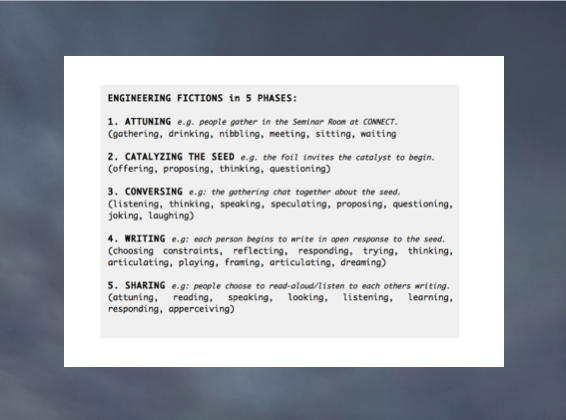 Engineering Fictions established a way of leading CTVR’s researchers (myself included) to an ‘elsewhere’ of communication and writing. This twilight experiment provided a time-space when different modes of speaking, listening, reading, writing, thinking and naming could take place. Engineering Fictions became a space for members and guests of CTVR to collectively inhabit and subtly transform the question of communicating communications through word and writing.