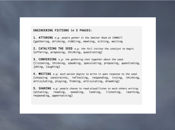 So, now I want to introduce you to one of the experiments I devised with/in CTVR, called Engineering Fictions. At its most simple, Engineering Fictions was a topic led, conversation and writing session which took place once or twice a month with/in CTVR, over a number of years.