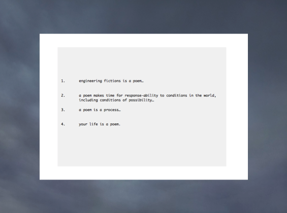 Engineering Fictions generated an in-between space where the function and act writing as communication was at stake. Albeit a gross simplification, I think it is fair to say that the expectation of writing, in the context of CTVR, was that it should, as Trin T. Minh-ha describes, “communicate, express, witness, impose, instruct, redeem, or save – at any rate to mean and send out an unambiguous message.”