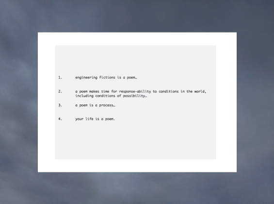 Writing, as a ‘communication’ practice, was often assumed to be modelled as an information event, described best by Claude Shannon’s ingenious mathematical theory. Minh-ha names this kind of assumption as the effect of a ‘Vertically Imposed Language.’ Under such conditions, Minh-ha asserts, writing becomes “reduced to a mere vehicle of thought and may be used to orient toward a goal or to sustain an act, but it does not constitute an act in itself.” Engineering Fictions began as a creative compulsion, on my part, to generate space for writing that assumed a map other than the ‘vertically imposed language’ described by Minh-ha.