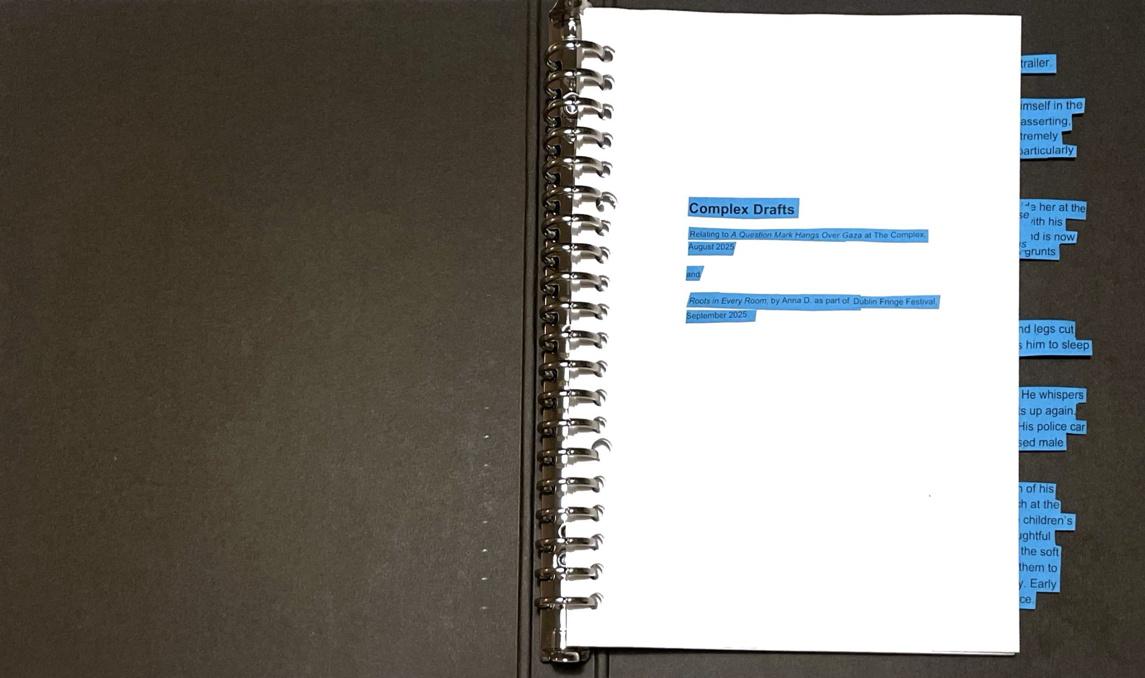 Draft I is a response to UNICEF: A QUESTION MARK HANGS OVER GAZA which took place 25 July – 12 August and Anna Doran’s Roots in Every Room, which took place from 06-08 September as part of Dublin Fringe Festival.
